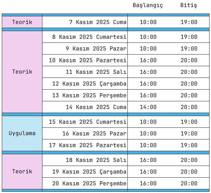 Eğitimler; belirtilen tarihler arasında sisteme giriş sağlayarak, sistem de yüklü olan videolarını izlenmesi gerekmektedir. Sınavlar; eğitim tarihinin son haftasında sisteme yüklenecektir. Belirlenen sürede sınavların çözülerek yönlendirilmesi gerekmektedir. Ödev gönderimi hakkında eğitim panelinizde bilgiler mevcuttur.